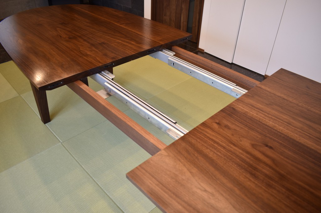 エクステンション用のスライドレールは、無垢材の重さに耐え得るものを海外から取り寄せ、脚と幕板の構造を工夫することで、デザイン的にも収まりよく仕上げました。