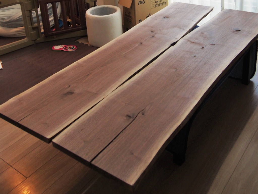 一枚板ではなく、ブックマッチ材でのご用意なので、1つにつき2枚用意されている状態です。
