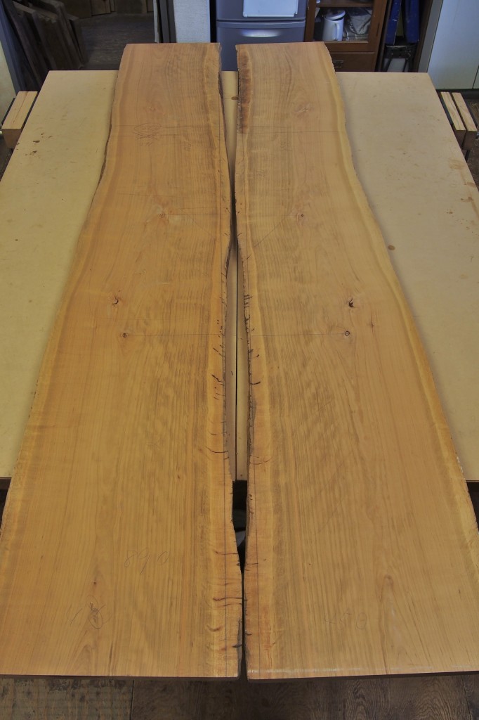 丸太材の一番幅の広い、並びの2枚を開いて接着するブックマッチ仕上げです。