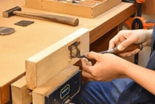 白書や毛引きを使った墨付けから、鑿と玄翁、鋸を使って組み手の基礎となる、穴あけ・ほぞ加工を学びます。(平面や直角の練習)