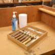 手洗いと併せて、適時の消毒をお願いしております。手洗い場、トイレに加え、各作業台ごとにアルコール消毒液、ウェットシートを設置。道具等の除菌を含め、ご自由にお使いいただけます。