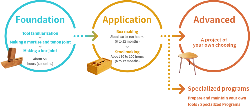 The preparation, adjustment, and sharpening of tools require deep knowledge. We have prepared specialized programs for those who want to be able to woodwork at home or make it their life's work.