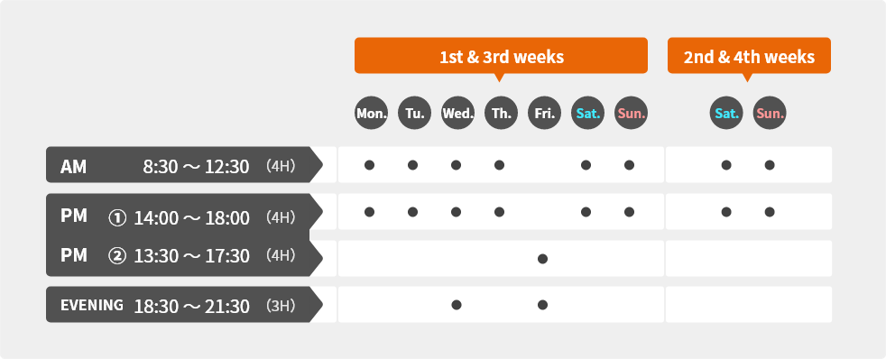 One course is held twice a month (every other week). Please select either [1st week/3rd week] or [2nd week/4th week]. There is no admission fee, so you can start with confidence.