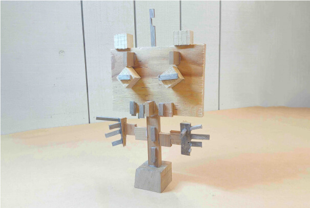- 端材を使っての人形作りです。倒したいモンスターやゾンビを作り、ボーリングの玉で倒すゲームに使います。モンスターやゾンビも動くものなので自立が基本。複雑な形の自立から、造形の面白さを学びます。(足し算の造形)
