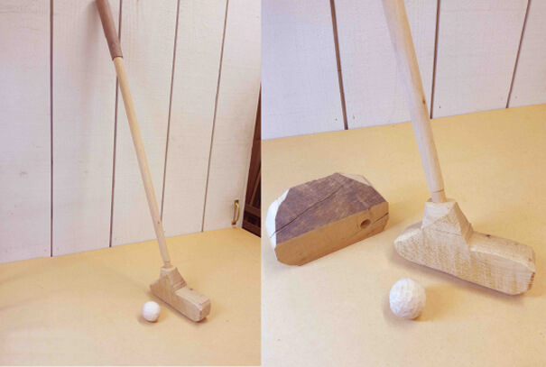 - 握りやすさ、打ちやすさ、を考えながら使いやすいゴルフパットを作ります。重さと速度から生じるモノの反発力を考察する力や他の子のパットと比較し改良します。木を削りながら造形する力を学びます。(引き算の造形)