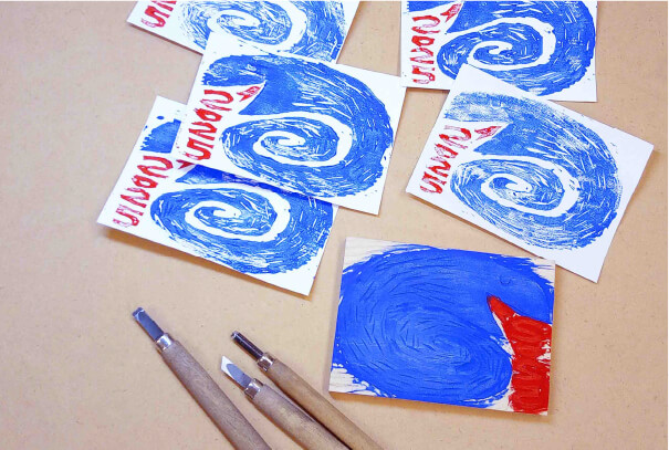 - 浮世絵の版木としても使われてきた日本のさくら材を使って本格的に版木制作と刷りに挑戦します。年賀状やクリスマスカードをオリジナルの絵柄で版を作って、インクをのせて刷りあげます。パソコンの時代だからこそ印刷の原点を学びます。