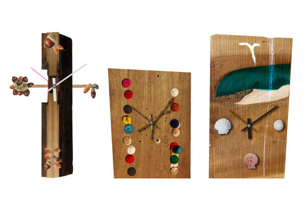 - 様々な樹種の中から好きな材を選び、オリジナルの時計を作ります。彫ったり、つけたり、ぬったり、木、ガラス、タイル、絵の具などを自由に使い針も自作します。何が正しい、美しいの学びの前に、まず自分として何が面白い、楽しい、ということから造形を考え始めます。