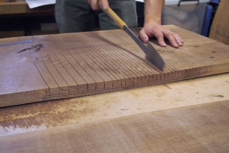 削り平面を出すことができない大鋸目仕上げ仕様となる天板。適材は滅多に生まれません。薄く裂いた丸太材が乾燥過程で全く反らないことはほとんどないからです。真っ平に乾燥した材を、さらに1年以上工房内で立て掛けておき、それでもほとんど反りが生じていない材でなくてはなりません。前もってそうした材が工房内に数枚あることを確認したうえで、ご提案します。こうした状況に即座にお応えするため、工房内の材木の木目や色合い、素性は全て把握しています。特殊な材は急に探してご用意できるものではないからです。そうした適材を使用しつつも、少し膨らんでいた箇所がありました。そうした箇所には裏から手鋸で切れ目を入れます。木の繊維を切り、クランプで平面を出しつつ接着していきます。量産方法ではできない、熟練技がここにあります。
